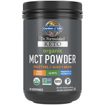 Medium Chain Triglycerides (MCTs) are naturally found in coconut oil and are quickly digested, absorbed and converted into energy for the body and brain.* Garden of Life's Organic MCT Powder is the perfect addition to your Keto pantry while providing convenience—no messy oil to deal with. This makes it perfect for travel or those on-the-go—just throw it in your luggage or gym bag. David Perlmutter, M.D. makes following a Keto Diet easy and delicious with this new line of products from Garden of Life. The Dr. Formulated Keto line is specifically crafted to help those who are seeking to enter into ketosis or stick to a low-carbohydrate diet. This new Keto Line of products is fully traceable, the third party certified for use on a keto diet and designed to be convenient for anyone who lives a busy lifestyle. All products in the Dr. Formulated Keto line are Keto Certified, Paleo Friendly Certified, and Non-GMO Project Verified. With Keto Meal and Keto Fit, Garden of Life also have taken the math out of the equation for you by providing the correct mix of fat, protein, and carbohydrates so you can follow your Keto diet more easily. Keto Organic MCT Powder Benefits: • Organic Acacia prebiotic fiber (0g net carbs) • No Palm Oil, fillers or hexane • Mixes easily, shelf-stable & convenient for travel • 1.5 Billion CFU Probiotics to support digestion*  Dietary Considerations Dairy/ Milk Free Organic Soy Free Preservative Free Free of Artificial Colors/Flavors Non-GMO Paleo Friendly Keto Certified  Serving Size:1 Scoop  Servings Per Container:30  Amount Per Serving Calories60 Total Fat6 g Saturated Fat6 g Total Carbohydrate3 g Dietary Fiber3 g Calcium34 mg Magnesium7 mg Organic Coconut Medium Chain Triglycerides6 g C8:0 - Caprylic Acid3.5 g C10:0 - Capric Acid2 g C12:0 - Lauric Acid0.5 g Organic Acacia Prebiotic Fiber3 g Lactobacillus plantarum (1.5 Billion CFU)10 mg  Suggested Use: Add to food or beverage (scoop included).  Contains: Tree Nuts (Coconut). *Naturally occurring. Made without dairy or soy ingredients, added sugars, filler ingredients, nor artificial colors, flavors, sweeteners or preservatives. Non-GMO. Organic. Keto Certified. Paleo Certified. Manufactured in a facility that also processes egg, milk, soy and tree nuts. For freshest flavor, refrigerate after opening and consume within 30 days. May also be stored in a cool, dry place. This product requires aeration at the time of filling. Over time, the powder will settle causing the container to appear under 70% full. Packaged by weight not volume. Net weight and servings are clearly marked.  Caution: As with any dietary supplement, consult your healthcare practitioner before using this product, especially if you are pregnant, nursing, anticipate surgery, take medication on a regular basis or are otherwise under medical supervision. Keep out of reach of children. Do not use if safety seal is broken or missing.