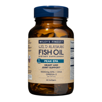 Just 1 softgel a day is all you need! Peak EPA is purified and concentrated to provide a Peak dose of EPA in every softgel. Peak EPA is clinically proven to increase Omega-3 levels in human muscle tissue and red blood cells. • Concentrated Wild Alaskan Fish Oil made at Wiley's Finest family owned and operated cGMP Refinery• Each softgel contains 750mg EPA and 250mg DHA for a total of 1000mg EPA + DHA• Only 1 softgel per day may reduce the risk of heart disease• Sustainable Alaskan fish caught by American fishers• Natural anti-inflammatory for joint flexibility Dietary Considerations Wheat Free Dairy/ Milk Free Gluten Free Soy Free Yeast Free Sugar Free Starch Free Corn Free Free of Artificial Colors/Flavors Shellfish Free Suggested Use Recommended Use: As a dietary supplement, take 1 softgel daily with food Serving Size: 1 SoftGel Servings Per Container: 60 Amount Per Serving % Daily Value Calories 15 Total Fat 1.5 g 2% Cholesterol 0 mg Concentrated Fish Oil 1250 mg EPA (Eicosapentaenoic Acid) 750 mg DHA (Docosahexaenoic Acid) 250 mg Other Ingredients Concentrated Omega-3 Ethyl Esters from Wild Alaska Pollock (Fish) Oil, Fish Gelatin, Glycerin, Purified Water, Mixed Tocopherols (to preserve freshness). Warnings Does Not Contain: Sugar, Gluten, Starch, Yeast, Wheat, Dairy, Artificial Flavors, Artificial Colors, Nuts, Shellfish, Soy or Corn. Contains Fish: Alaska Pollock (Gadus chalcogrammus) Consult your physician before use if you are pregnant, nursing, have a medical condition, or are taking any medications (including anticoagulant or NSAID drugs), or are planning any medical or surgical procedures. KEEP OUT OF REACH OF CHILDREN