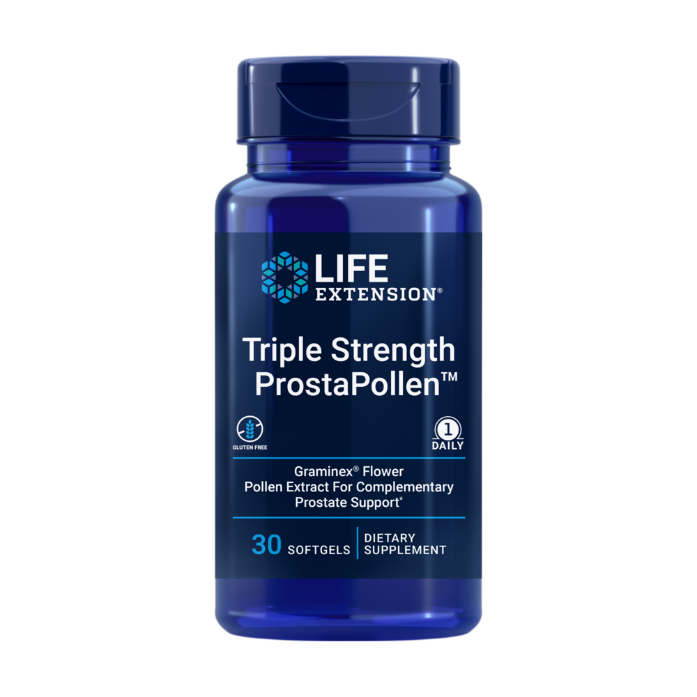 Protect your prostate and maintain its healthy function Clinical studies have demonstrated that the innovative triple dose of flower pollen extracts in Triple Strength ProstaPollen provide support for prostate health and function at any age. Dietary considerationsGluten free Serving size: 1 Softgel Servings per container: 30 Suggested Use: Take one (1) softgel daily, or as recommended by a healthcare practitioner. Amount Per ServingGraminex 378 mg Flower Pollen Extract (from rye) triple strength concentrated blend providing: Graminex G60 360 mg (water-soluble fraction) Graminex NAX 18 mg (lipid-soluble fraction) Other ingredients: extra virgin olive oil, softgel (gelatin, glycerin, purified water, carob color), soy lecithin, yellow beeswax, maltodextrin. Contains soybeans. Gluten free - Non-GMO - Vegetarian Warnings: KEEP OUT OF REACH OF CHILDREN. DO NOT EXCEED RECOMMENDED DOSE. Do not purchase if outer seal is broken or damaged. When using nutritional supplements, please consult with your physician if you are undergoing treatment for a medical condition or if you are pregnant or lactating. Graminex is a registered trademark of Graminex LLC.