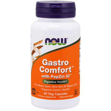 Digestive Health* NOW Gastro Comfort is formulated to support a healthy stomach lining.* Gastro Comfort features the clinically tested ingredient PepZin GI, which is a proprietary form of zinc complexed with carnosine that has been shown to support the integrity of the stomach lining by promoting its own natural healing processes.* Gastro Comfort also includes mastic gum, a resin from the mastic tree, which has traditionally been used to maintain gastric health.* In addition, this product has slippery elm and aloe vera to support a healthy digestive system.* Plus Mastic Gum, Aloe Vera & Slippery Elm Supports Gastric Health* Dietary Considerations Wheat Free Dairy/ Milk Free Gluten Free Vegetarian Soy Free Yeast Free Vegan Corn Free Egg Free Shellfish Free Non-GMO Fish Free Serving Size:Â 1 Vegetable Capsule Servings Per Container:Â 60 Amount Per Serving% Daily Value Zinc (from PepZin GI)5 mg45% PepZin GI (Zinc-L-Carnosine Complex)37.5 mg Mastic Gum Powder (Pistacia lentiscus) (Sap)50 mg Organic Aloe Vera (Aloe barbadensis) (Inner Leaf) (200:1)50 mg Slippery Elm (Ulmus rubra) (Bark)100 mg Other Ingredients: Rice Flour, Hypromellose (cellulose capsule), Stearic Acid (vegetable source) and Silicon Dioxide. Suggested Usage:Â Take 1 capsule twice daily, with or without meals. Taking this product for at least eight weeks is recommended for best results. Caution:Â For adults only. Consult physician if pregnant/nursing, taking medication, or have a medical condition. Keep out of reach of children. Natural color variation may occur in this product. PepZin GI is a trademark of Hamari Chemicals, Ltd.