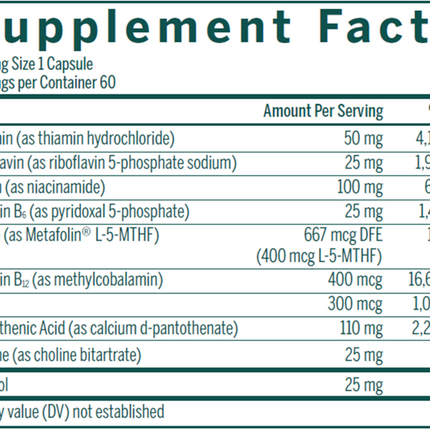 ACTIVE B Complex supports the formation of healthy red blood cells and macronutrient metabolism. Each capsule provides the entire B-vitamin family, including vitamins B1, B2, B3, pantothenic acid B6, biotin, folate, and B12. Active B Complex uses the preferred active forms of vitamins B2 (riboflavin-5-phosphate), B6 (pyridoxal-5-phosphate), folate (Metafolin), and B12 (methylcobalamin). Metafolin, a calcium salt of L-methylfolate, may be more bioavailable than folic acid. In one study involving healthy women supplemented with 400 mcg of either L-methylfolate or folic acid for 24 weeks, the women receiving the L-methylfolate supplement had higher red blood cell folate concentrations.
