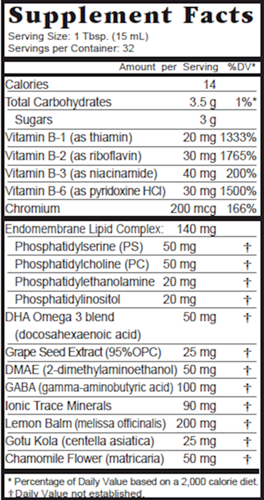 • In addition, B Vitamin Complex, minerals and herbal blend including Lemon Balm, Gotu Kola and Chamomile also help calm and are important for brain function.