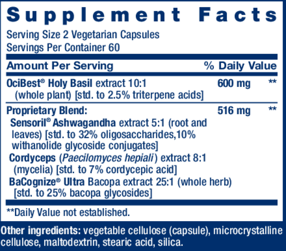Adrenal Energy Formula combines four stress-modulating extracts—holy basil, cordyceps, bacopa and ashwagandha—each scientifically validated to help support a healthy response to stress.