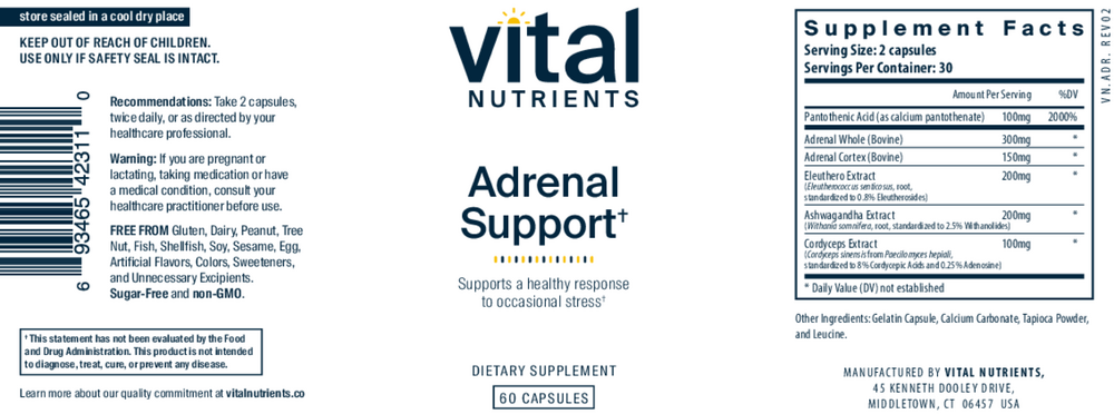 Adrenal Support is a combination of whole adrenal, adrenal cortex and adaptogenic herbs that nutritionally support the adrenal glands.The formula includes Ashwagandha Root extract to help maintain balanced levels of adrenal hormones and promote a general sense of well-being. The formula also includes Pantothenic Acid (vitamin B5), which is an important cofactor for macronutrient metabolism and hormone synthesis. The ingredients in Adrenal Support work together to enhance the body's ability to produce certain adrenal hormones, which helps support the immune system and relieve mild stress and frustration.