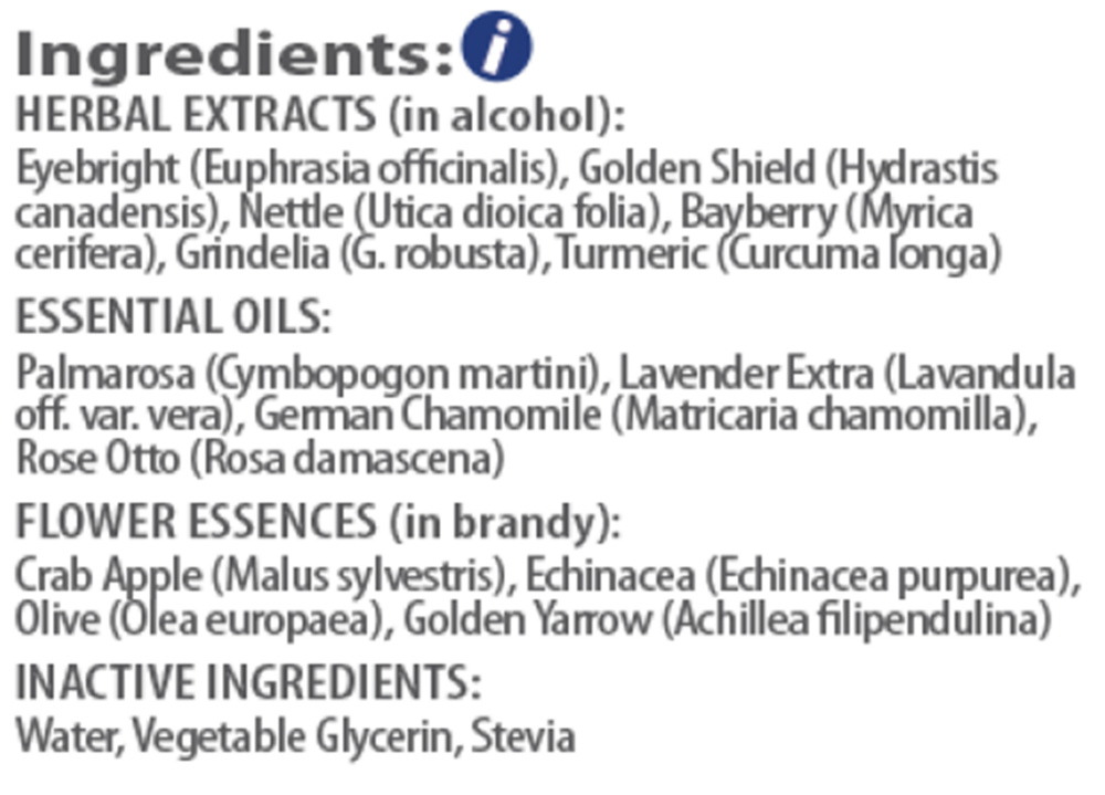 Nettle Leaf Extract, Golden Seal Extract, Eyebright Extract, Bayberry Extract, Filtered Water, Grindelia Extract, Turmeric Extract, Vegetable Glycerin, Palmarosa Essential Oil, Lavender Extra Essential Oil, Crab Apple Flower Essence, Echinacea Flower Essence, Olive Flower Essence, Golden Yarrow Flower Essence, German Chamomile CO2 Essential Oil, Rose Otto Essential Oil, Stevia.
