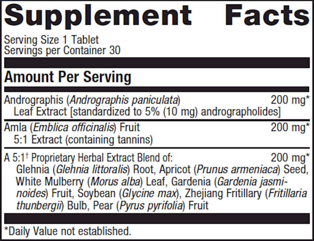 Ingredients: Microcrystalline cellulose, andrographis leaf extract, amla fruit extract, glehnia root extract, apricot seed extract, white mulberry leaf extract, gardenia fruit extract, soybean (soy), zhejiang fritillary bulb extract, pear fruit extract, cellulose, croscarmellose sodium, calcium silicate, stearic acid (vegetable), silica, magnesium stearate (vegetable), and coating (hypromellose, medium chain triglycerides, and hydroxypropylcellulose).