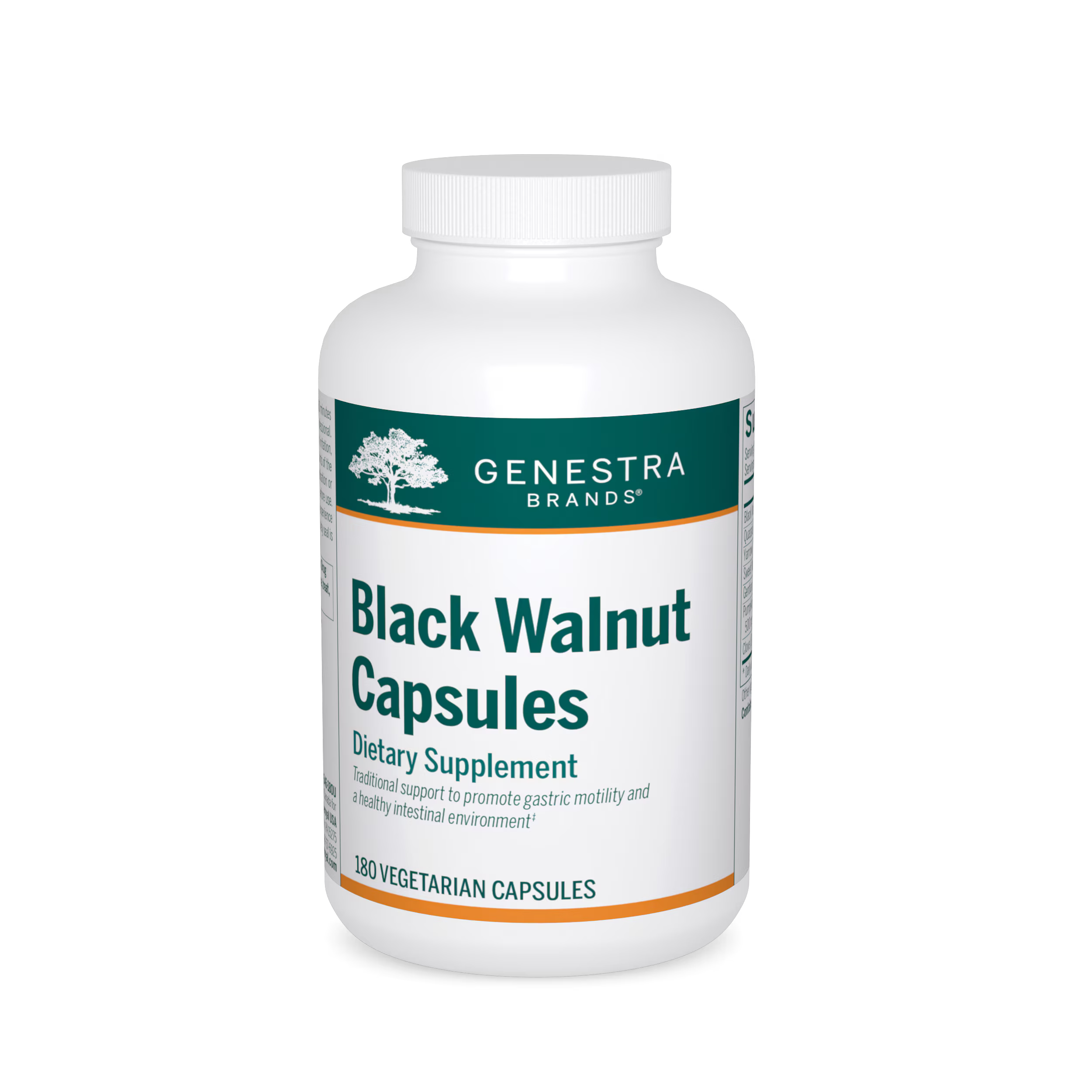 Black Walnut Capsules is a blend of herbs that are traditionally used to support digestive health. Black walnut, quassia, wormwood and gentian root all contain extremely bitter compounds, including tannins, quassin, absinthin, and amarogentin. These bitters cause nerves on the taste buds to increase the release of saliva and gastric juices that aid in digestion. Bitters can also bind receptors on endocrine cells of the gastrointestinal tract and pancreas, which results in the secretion of the peptide hormone cholecystokinin. In turn, this releases bile salts and pancreatic digestive enzymes, increasing gastric motility. Gentian root and quassia may help support digestion by increasing prostaglandin-mediated cytoprotection in the gastric membrane; prostaglandins stimulate the release of mucous and sodium bicarbonate in the stomach.