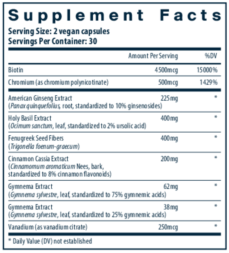 Blood Sugar Support contains a synergistic blend of eight ingredients to provide support for optimal pancreatic function. American Ginseng, an herb, promotes healthy post-prandial glucose levels. Holy Basil and Gymnema Sylvestre have been used for centuries in Ayurvedic practice for similar purposes. Chromium assists with the maintenance of lean muscle mass in healthy individuals, and maintaining beneficial levels of HDL already in the normal range. Used in Asia for a variety of health issues, Cinnamon also has a beneficial effect in the maintenance of already normal-range blood sugar levels in healthy people. Packaging and labels may vary.