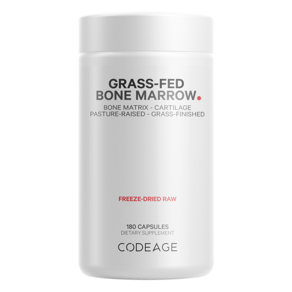 $39.99Codeage Grass-fed Bone Marrow supplements are freeze-dried, desiccated, and non-defatted. This formula provides 3,000 mg of grass-fed and pasture-raised bovine bone including, bone matrix, marrow, and cartilage per serving. Whole beef bone extracts can offer a source of specialized cells, collagen, growth factors, fat-soluble activators, trace minerals, and glycosaminoglycans.