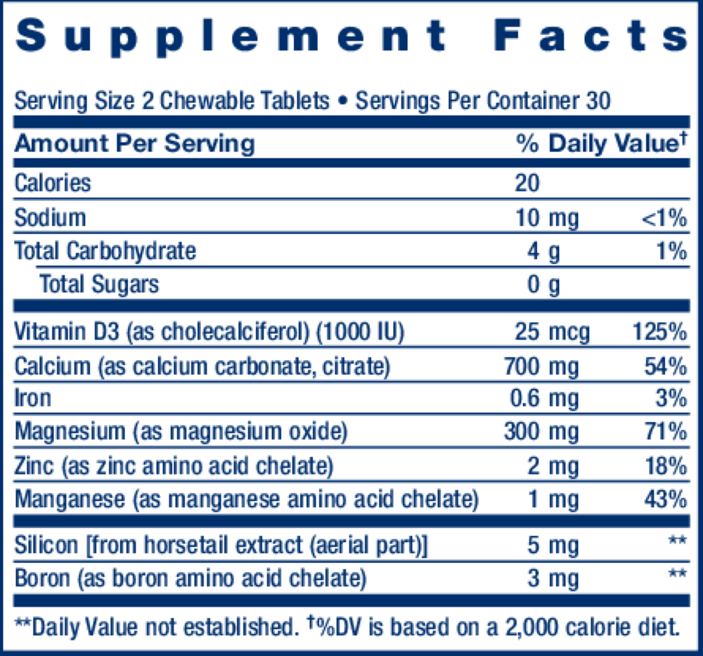 Chew two (2) tablets daily, or as recommended by a healthcare practitioner. Scientific studies suggest calcium supplementation in divided doses with food in the morning and evening may yield the best results. Do not swallow tablets whole. Maintaining an optimal vitamin D blood level also helps maximize calcium absorption.