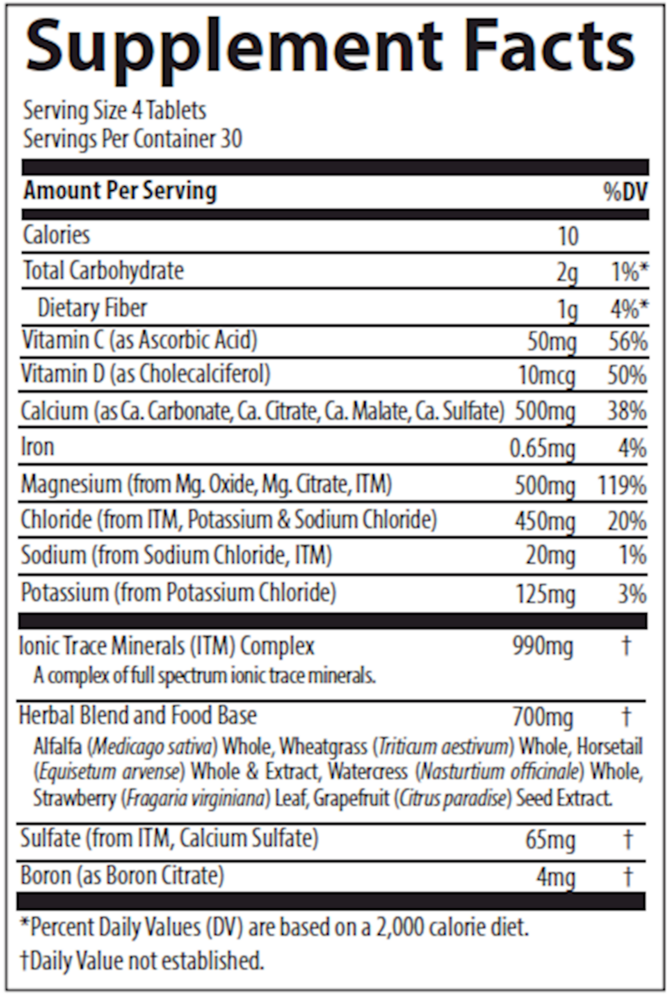 Suggested Use: take 4 tablets daily with food. Also includes over 72 naturally occurring ionic trace minerals from seawater.