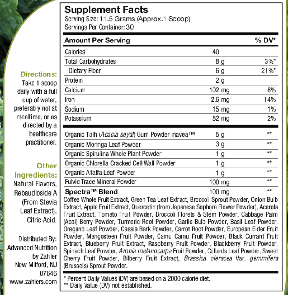 Coffee Whole Fruit Extract, Green Tea Leaf Extract, Broccoli Sprout Powder, Onion Bulb Extract, Apple fruit extract, Quercetin(from Japanese Sophora Flower Powder) Acerola Fruit Extract, Tomato Fruit Powder, Broccoli Florets & Stern Powder, Cabbage Palm Acai Berry Powder, Turmeric Root Powder, Garlic Bulb Powder, Basil Leaf Powder, Oregano Leaf Powder, Cassia Bark Powder, Carrot Root Powder, European Elder Fruit Powder, Mangosteen Fruit Powder, CAmu Camu fruit Powder, Black Currant Fruit Extract, Blueberry Fruit Extract, Raspberry Fruit Powder, Blackberry fruit powder, Spinach Leaf Powder, Aronia Meianocarpa Fruit Powder Collards Leaf Powder, Sweet Cherry fruit Powder, Bilberry Fruit Extract, Brassica oleracea var. Gemmifera (Brussels) Sprout Powder.