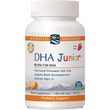 Kids everywhere love Nordic Naturals strawberry-flavored DHA Junior. Made entirely from Arctic cod liver oil, this product is rich in the omega-3 DHA. DHA is essential for the proper development of the brain, eyes, and nervous and immune systems.* Easily swallowed or chewed by children over three, DHA Junior also contains healthy levels of 100% natural vitamins A and D.