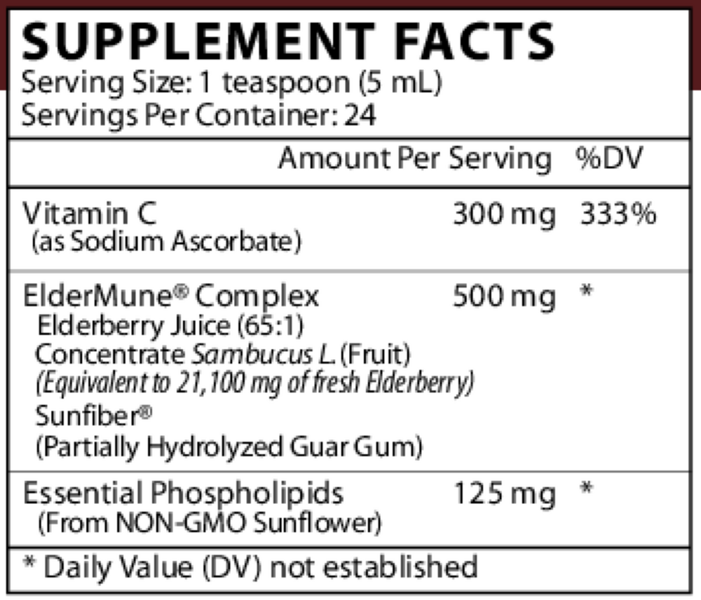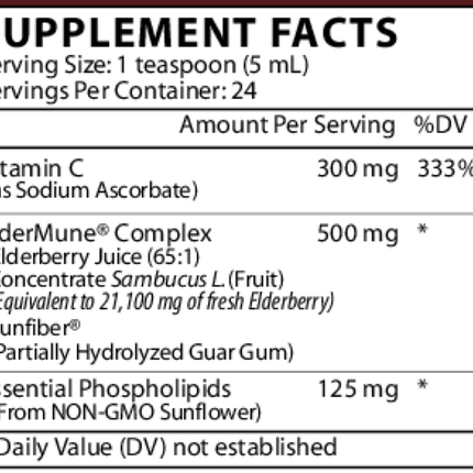 Elderberry contains a potent Black Elderberry Juice 65:1 Concentrate, Vitamin C, and Sunfiber for optimal immune support, in nano-encapsulated liposomal liquid form. Sunfiber, a soluble, prebiotic dietary fiber, has synergistic effects on digestibility shown to enhance the absorption of nutrients.