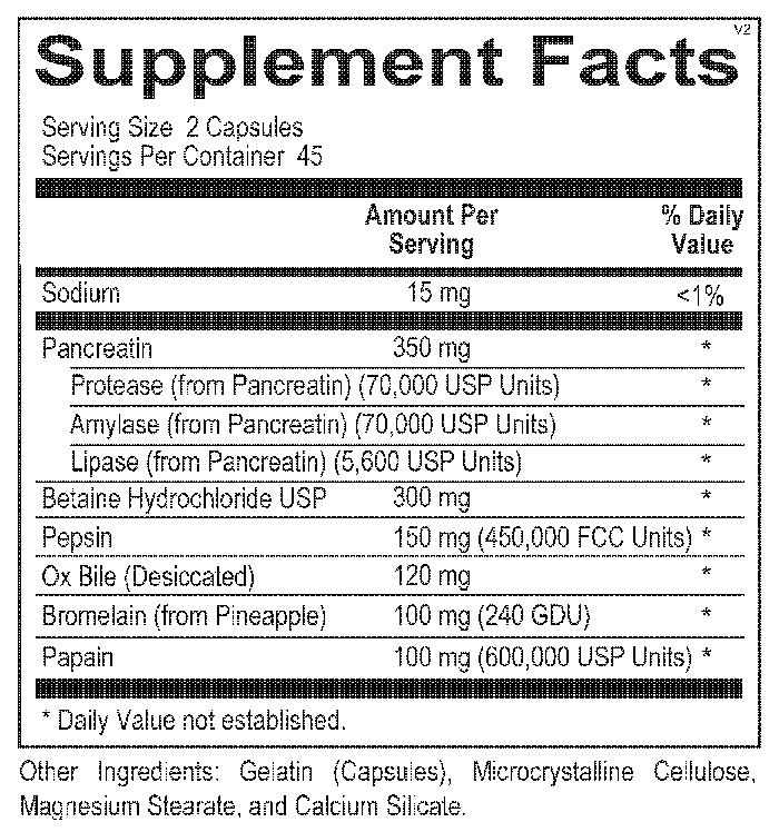 This sets up the second stage of digestion, the enteric phase, in which high-concentration pancreatin 8x, which includes protease, amylase, lipase, and trypsin, is released and activated in the small intestine to ensure proper protein breakdown and fat absorption.