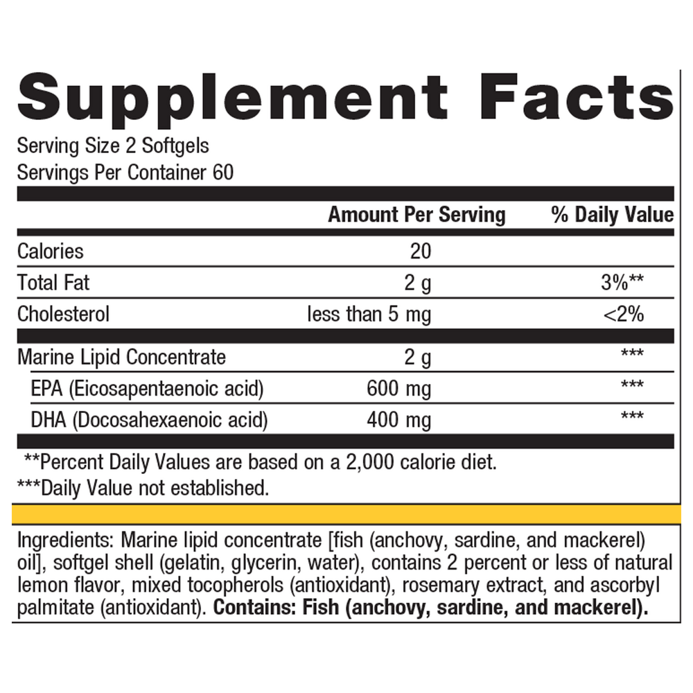 Marine lipid concentrate [fish (anchovy, sardine, and mackerel) oil], softgel shell (gelatin, glycerin, water), contains 2 percent or less of natural lemon flavor, mixed tocopherols (antioxidant), rosemary extract, and ascorbyl palmitate (antioxidant).
