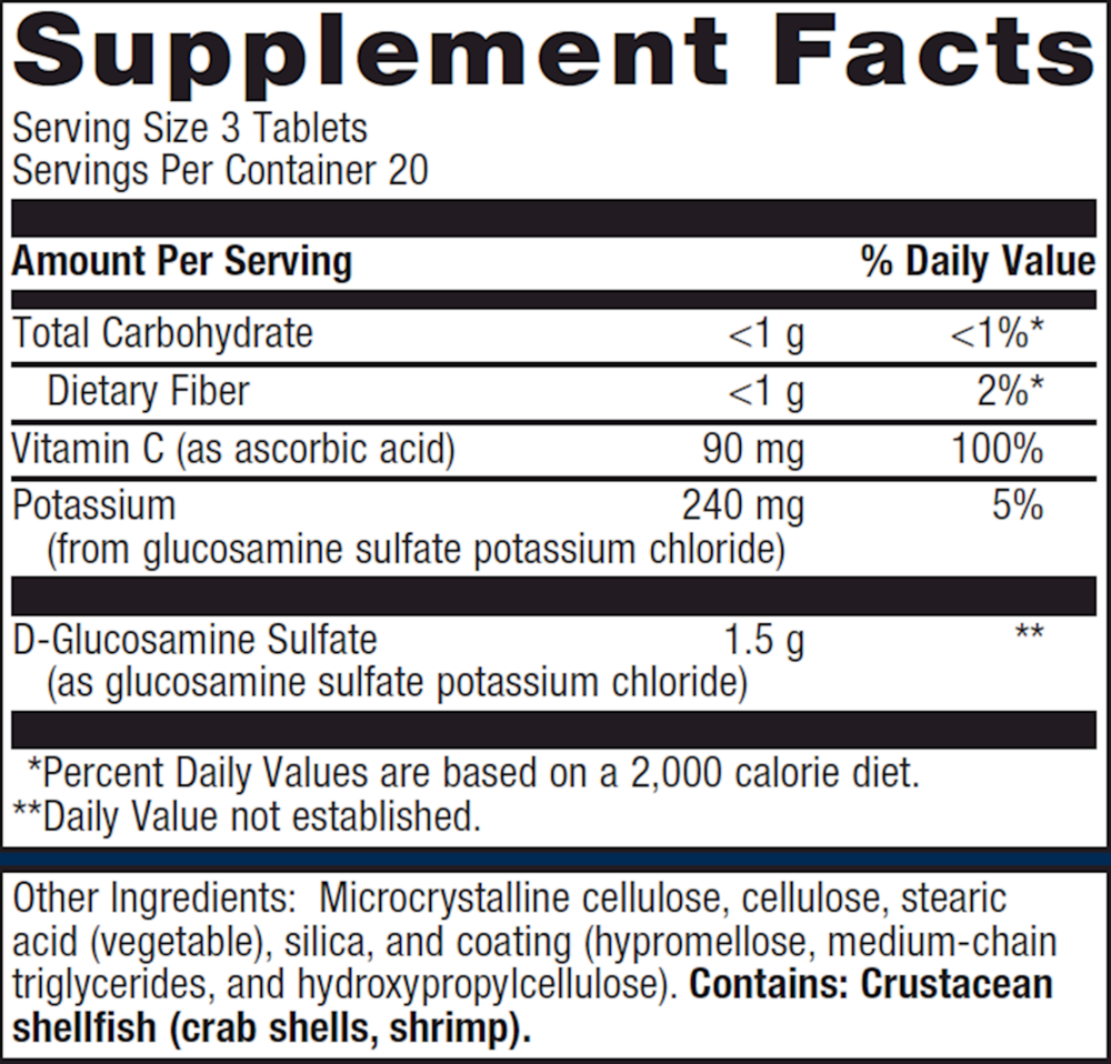 Ingredients: Glucosamine sulfate potassium chloride [crustacean shellfish (crab shells, shrimp)], microcrystalline cellulose, cellulose, ascorbic acid, stearic acid (vegetable), silica, croscarmellose sodium, and coating (hypromellose, medium-chain triglycerides, and hydroxypropylcellulose). Contains: Crustacean shellfish (crab shells, shrimp).