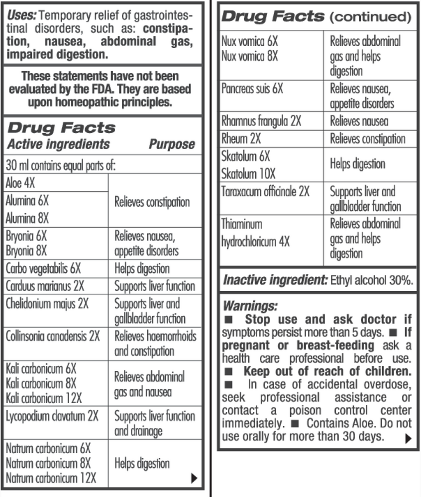 Ingredients: Aloe socotrina 2X, Alumina 6X/8X, Bryonia alba 6X/8X, Carduus marianus 2X, Chelidonium majus 2X, Cholecalciferol 2X, Collinsonia canadensis 2X, Colon, Porcine 6X/12X/30X, Kali carbonicum 6X/8X/12X, Natrum carbonicum 6X/8X/12X, Niacin 2X, Nux vomica 6X/8X, Pantothenic acid 2X, Rectum, Porcine 6X/12X/30X, Rhamnus frangula 2X, Rheum 2X, Skatolum 6X/10X, Taraxacum officinale 2X, Thiaminum hydrochloricum 4X.
