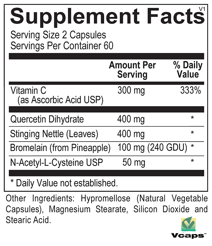 Bromelain enhances the absorption of quercetin and supports the health of mucosal tissue. Stinging nettle leaf balances hyper-immune responses, and N-acetyl cysteine clears the airways by promoting the normal viscosity of mucus.