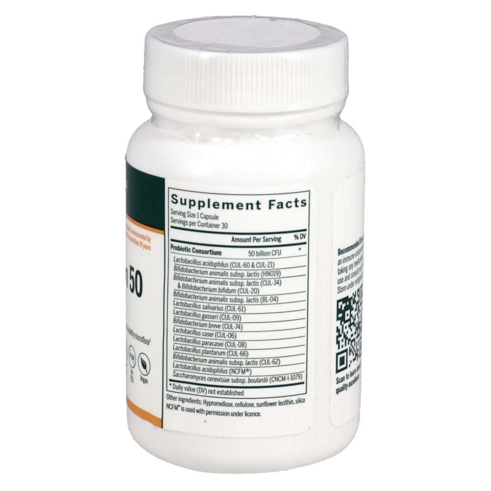HMF Multi Strain 50 capsules include 50 billion CFU from a combination of 15 probiotic strains. These research-driven strains were selected based on their ability to support both gastrointestinal and immune health. HMF Multi Strain 50’s probiotic consortium contains proprietary human-sourced strains, and includes 8 strains of Lactobacilli and 6 strains of Bifidobacteria. Saccharomyces cerevisiae subsp. boulardii (CNCM-I-1079) live yeast cells are also provided for additional microflora support.