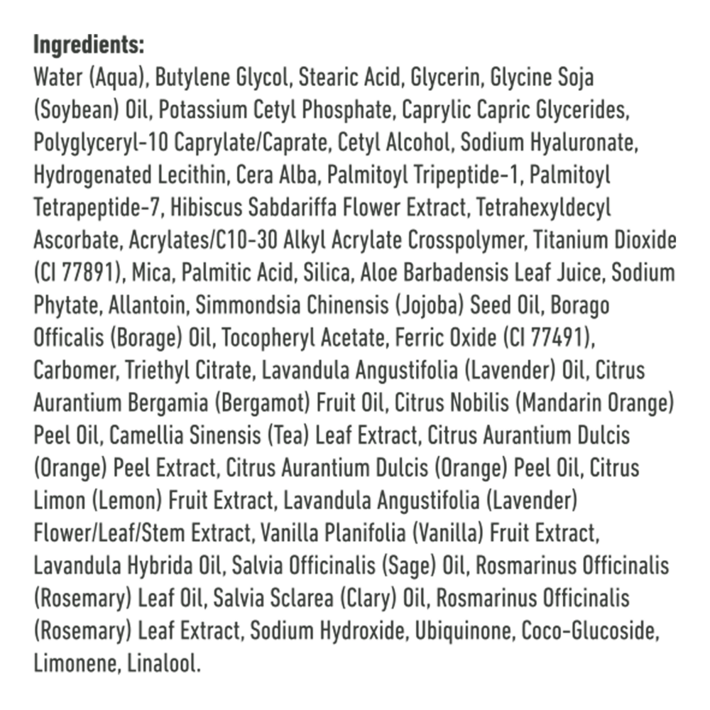 Ingredients: Water (Aqua), Butylene Glycol, Stearic Acid, Glycerin, Glycine Soja (Soybean) Oil, Potassium Cetyl Phosphate, Caprylic Capric Glycerides, Polyglyceryl-10 Caprylate/Caprate, Cetyl Alcohol, Sodium Hyaluronate, Hydrogenated Lecithin, Cera Alba, Palmitoyl Tripeptide-1, Palmitoyl Tetrapeptide-7, Hibiscus Sabdariffa Flower Extract, Tetrahexyldecyl Ascorbate, Acrylates/C10-30 Alkyl Acrylate Crosspolymer, Titanium Dioxide (CI 77891), Mica, Palmitic Acid, Silica, Aloe Barbadensis Leaf Juice, Sodium Phytate, Allantoin, Simmondsia Chinensis (Jojoba) Seed Oil, Borago Officalis (Borage) Oil, Tocopheryl Acetate, Ferric Oxide (CI 77491), Carbomer, Triethyl Citrate, Lavandula Angustifolia (Lavender) Oil, Citrus Aurantium Bergamia (Bergamot) Fruit Oil, Citrus Nobilis (Mandarin Orange) Peel Oil, Camellia Sinensis(Tea) Leaf Extract, Citrus Aurantium Dulcis (Orange) Peel Extract, Citrus Aurantium Dulcis (Orange) Peel Oil, Citrus Limon (Lemon) Fruit Extract, Lavandula Angustifolia (Lavender) Flower/Leaf/Stem Extract, Vanilla Planifolia (Vanilla) Fruit Extract, Lavandula Hybrida Oil, Salvia Officinalis (Sage) Oil, Rosmarinus Officinalis (Rosemary) Leaf Oil, Salvia Sclarea (Clary) Oil, Rosmarinus Officinalis (Rosemary) Leaf Extract, Sodium Hydroxide, Ubiquinone, Coco-Glucoside, Limonene, Linalool.