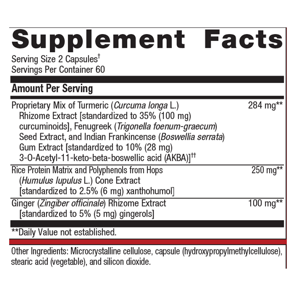 (Curcuma longa L.) Rhizome Extract [standardized to 35% (100 mg) curcuminoids], Fenugreek (Trigonella foenum-graecum) Seed Extract, and Indian Frankincense (Boswellia serrata) Gum Extract [standardized to 10% (28 mg)