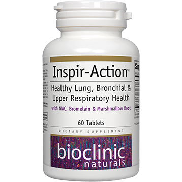 Inspir-Action offers relief for sinus discomfort, respiratory congestion and cough. This synergistic combination builds and maintains healthy lung and bronchial passageways, offering support for the entire respiratory system. Inspir-Action quickly loosens phlegm and bronchial secretions and helps soothe irritated bronchial passages. Contains no artificial preservatives, colors or sweeteners; no dairy, gluten, soy, wheat or yeast. Bioclinic Naturals products are guaranteed to meet or exceed Good Manufacturing Practices (GMP) of the Canadian Government and the Therapeutic Goods Administration (TGA) regulations of Australia— among the world’s highest standards for natural products.