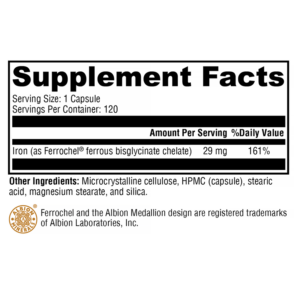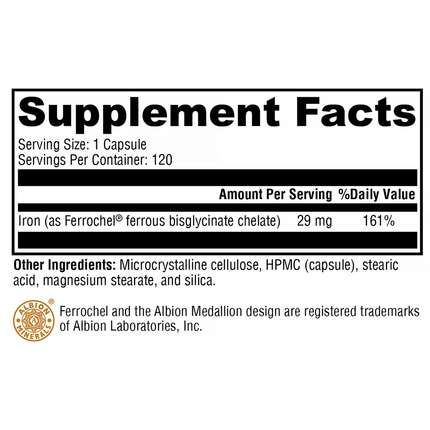 $25.99Iron bis-glycinate is a well-studied, 100% fully-reacted, patented form of iron exclusively from Albion Laboratories. The amino acid glycine is actually one of the two starting materials the body uses to synthesize hemoglobin. Therefore, Iron Glycinate contributes two key factors. This form of iron has higher bioavailability, lower toxicity, less food reactivity, less food interactions and has a longer shelf life than any other common form of iron.