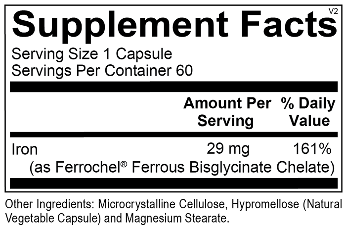 Reacted Iron provides 29 mg of elemental iron per serving, ideally formulated using the amino acid chelate form of iron (ferrous bisglycinate) for enhanced absorption, optimal utilization and gastrointestinal (GI) comfort. Some individuals, who take other forms of iron supplements, may experience GI side effects, including gas, bloating, constipation or a combination of these symptoms. Supplementing the right form of iron can be key to maintaining healthy levels within the body and compliance to a supplement regimen.