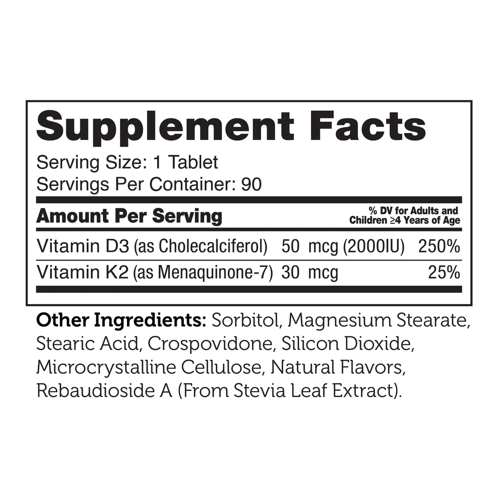 Both Vitamins D3 & K2 are fat soluble nutrients which are necessary to support bone density and aid with calcium absorption. Additionally, these two vitamins support cardiovascular and immune health.