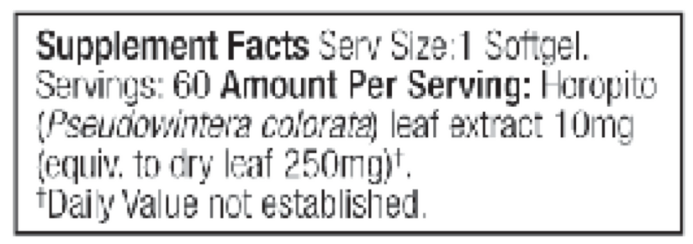 Amount Per Serving: Pseudowintera colorata (Horopito) leaf liquid extract 10mg equiv. to dry leaf 250mg