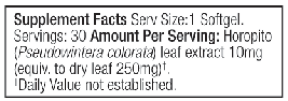 Amount Per Serving: Pseudowintera colorata (Horopito) leaf liquid extract 10mg equiv. to dry leaf 250mg