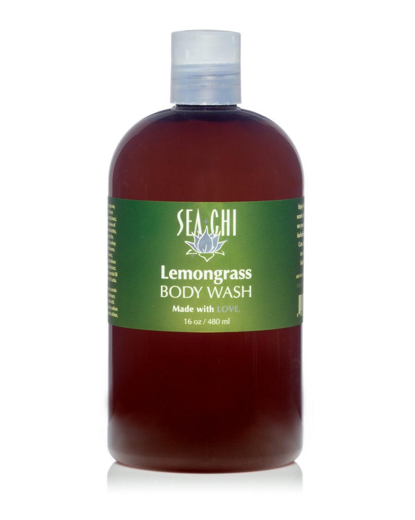 Sea Chi Organics Lemongrass Body Wash 480ml / 16oz Amber plastic bottle w/ white flip cap
