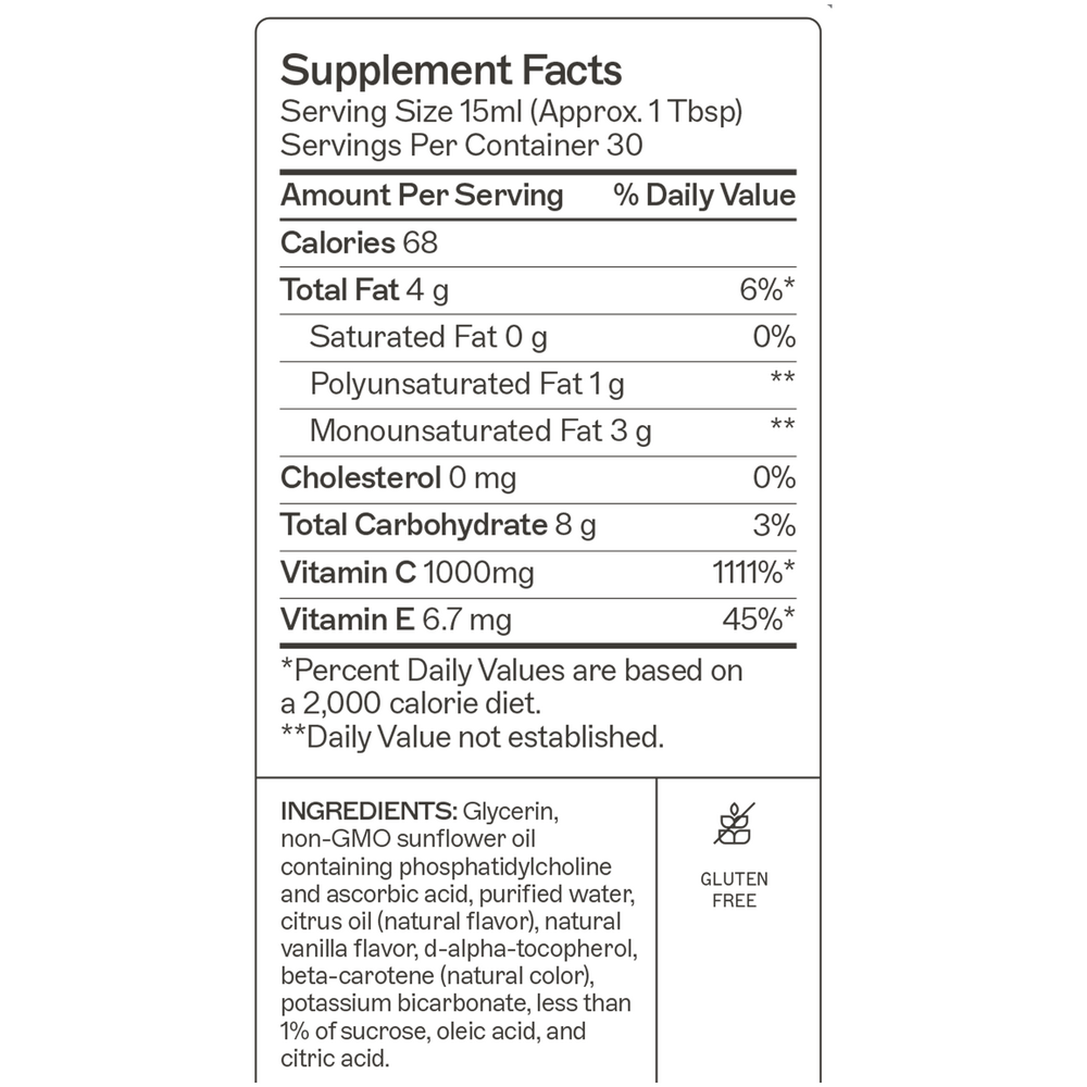 Glycerin, non-GMO sunflower oil containing phosphatidylcholine and ascorbic acid, purified water, citrus oil (natural flavor), natural vanilla flavor, d-alpha tocopherol, beta-carotene (natural color), potassium bicarbonate, less than 1% of sucrose, oleic acid, and citric acid.