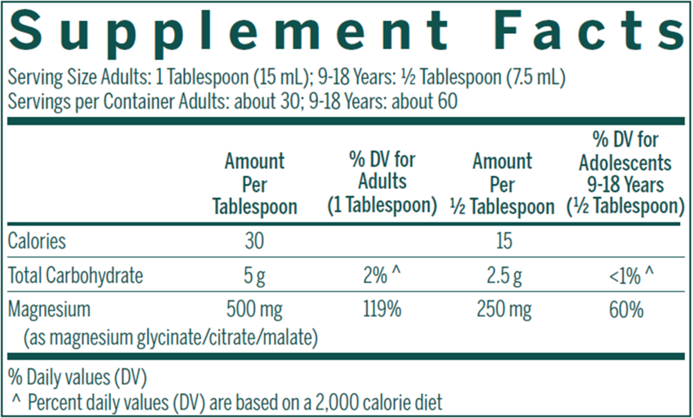 Magnesium Complex Liquid is a concentrated combination of three organic magnesium sources: magnesium glycinate, citrate and malate. Insufficient magnesium intake is estimated to occur in approximately two-thirds of the American population, making it is one of the most common nutritional deficiencies. Magnesium plays an important role in regulating insulin-mediated glucose uptake, and low serum magnesium levels are associated with decreased insulin secretion. In healthy participants with low serum magnesium levels, daily supplementation with 300 mg of magnesium has been shown to improve glucose metabolism and pancreatic ß-cell function. Each tablespoon serving of Magnesium Complex Liquid provides 500 mg of magnesium to help prevent magnesium deficiency, maintain cardiovascular health, promote healthy glucose metabolism, and support muscle function.