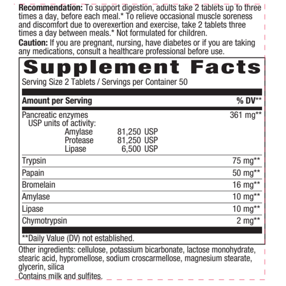 To support digestion, adults take 2 tablets up to three times a day, before meals. To relieve occasional muscle soreness and discomfort due to overexertion and exercise, take 2 tablets three times a day between meals. Not formulated for children.