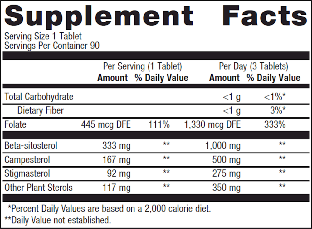 Plant sterol complex (soy), microcrystalline cellulose, croscarmellose sodium, cellulose, stearic acid (vegetable), silica, and calcium L-5-methyltetrahydrofolate.