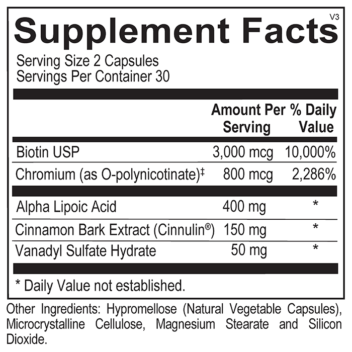 Chromium is added to support glucose tolerance factor (GTF) production, a critical component in cellular glucose uptake. Vanadyl sulfate and biotin are also included to increase insulin sensitivity and support metabolic efficiency.