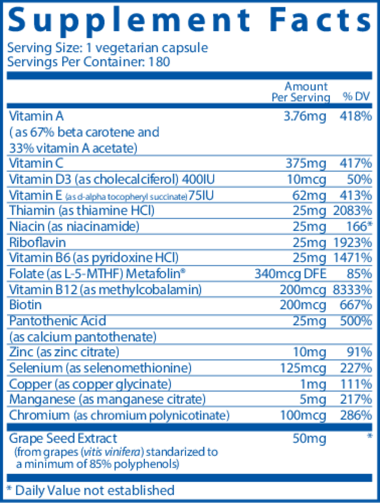 Minimal & Essential is a full-spectrum one- or two-a-day multi-vitamin/mineral formula that provides the minimum daily requirements of vitamins and some essential minerals. This formula contains a potent antioxidant complex including vitamins A, C, E and the mineral selenium. It contains a range of B vitamins, which are used in the metabolism of protein and fats, and maintenance of muscle tone in the gastrointestinal tract. B vitamins also support healthy nerve cells and maintain homocysteine levels that are already in the normal range.