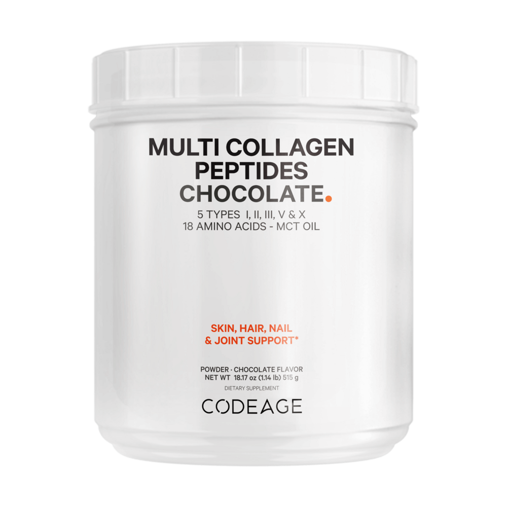 $49.99Codeage Multi Collagen Peptides Chocolate Powder offers 5 different types of collagen (type 1, 2, 3, 5 & 10) from 5 different sources. It contains grass-fed beef, free-range chicken bone broth, organic beef bone broth, wild-caught marine collagen and egg shell membrane collagen all-in-one. This formula also features MCT oil powder and 18 amino acids. It comes in a delicious chocolate flavor and is easy to mix in hot liquids. Use a shaker cup or a blender with cold liquids. This chocolate collagen supplement is a delicious way to add a collagen boost to all your drinks, protein shakes, smoothies, teas, coffees, and other beverages or treats.