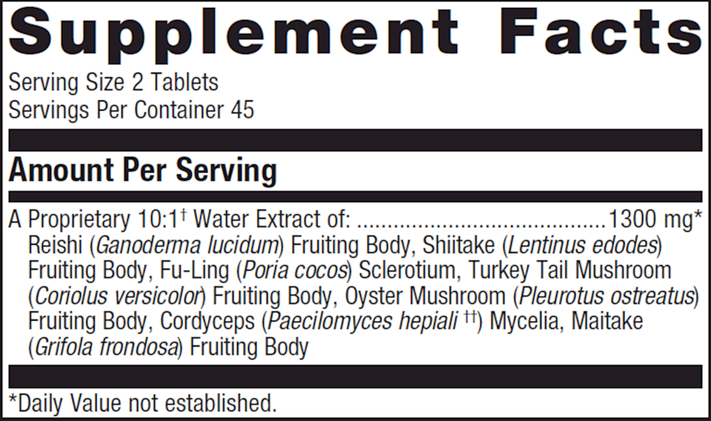 Reishi (Ganoderma lucidum) Fruiting Body, Shiitake (Lentinus edodes) Fruiting Body, Fu-Ling (Poria cocos) Sclerotium, Turkey Tail Mushroom (Coriolus versicolor) Fruiting Body, Oyster Mushroom (Pleurotus ostreatus) Fruiting Body, Cordyceps (Paecilomyces hepiali ††) Mycelia, Maitake (Grifola frondosa) Fruiting Body