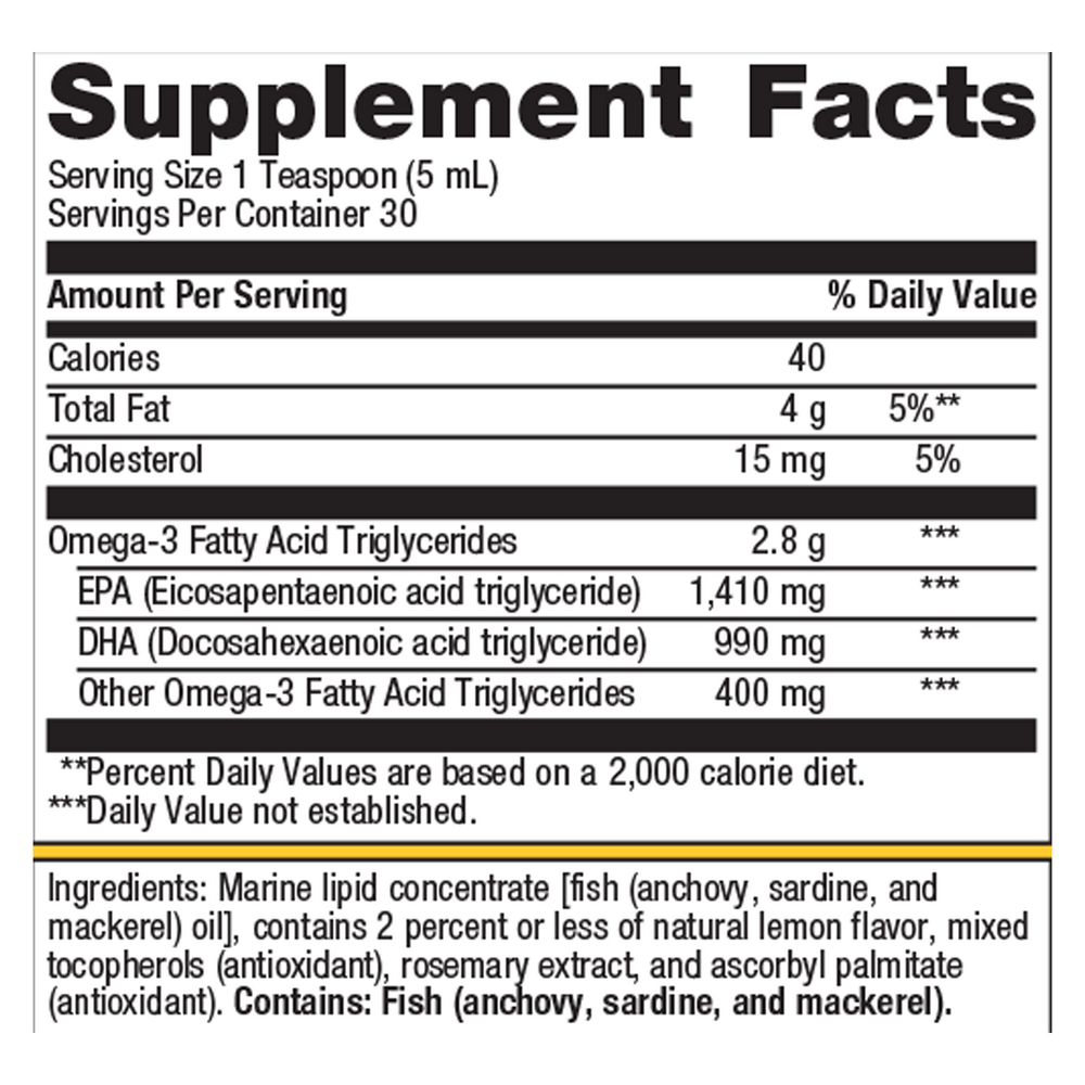 Marine lipid concentrate [fish (anchovy, sardine, and mackerel) oil], contains 2 percent or less of natural lemon flavor, mixed tocopherols (antioxidant), rosemary extract, and ascorbyl palmitate (antioxidant).
