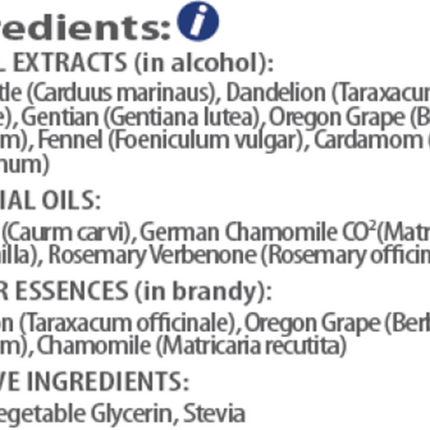 Digestive Nectar Tri-Essence Power Blend contains stimulating, detoxifying and soothing botanicals. The flower essences in this formula help soothe a fiery nature and dissolve the accumulated hardness from over-striving in life. They help remove stress and mistrust, for increased receptivity to nourishment.