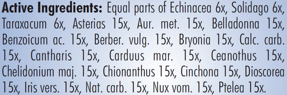 Equal parts of Carduus marianus 3x, Echinacea 3x, Solidago virgaurea 3x, Taraxacum officinale 3x, Asterias rubens 15x, Aurum metallicum 15x, Belladonna 15x, Benzoicum acidum 15x, Berberis vulgaris 15x, Bryonia 15x, Calcarea carbonica 15x, Cantharis 15x, Ceanothus americanus 15x, Chelidonium majus 15x, Chionanthus virginica 15x, Cinchona officinalis 15x, Dioscorea villosa 15x, Iris versicolor 15x, Natrum carbonicum 15x, Nux vomica 15x, Ptelea trifoliata 15x.