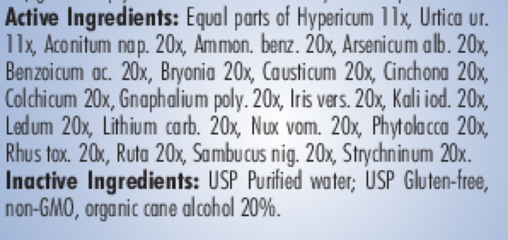 Aconitum nap. 20x, Ammonium benzoicum 20x, Arsenicum alb. 20x, Benzoicum acidum 20x, Bryonia 20x, Causticum 20x, Cinchona 20x, Colchicum 20x, Gnaphalium polycephalum 20x, Iris versicolor 20x, Kali iod. 20x, ledum 20x, lithium carb. 20x, Nux vom. 20x, Phytolacco 20x, Rhus toxicodendron 20x, Ruta 20x, Sambucus nig. 20x, Strychninum 20x, Hypericum 8x, Urtico ur. 8x, Hypericum 3x, Urtico ur. 3x. Inactive Ingredients: USP Purified Inactive Ingredients: USP Purified water; USP Gluten-free, non-GMO, organic cane dispensing alcohol 20%.