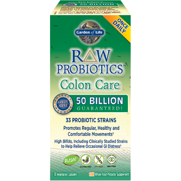Garden of Life RAW Probiotics Colon Care supports regular, healthy and comfortable movements.* Supporting a healthy balance of beneficial bacteria in the colon helps to support a properly functioning digestive system and overall wellbeing.* Each high-potency RAW Probiotics formula contains a naturally diverse group of over 30 beneficial probiotics strains from Bulgarian yogurt and Eastern European wild kefir, guaranteed to Arrive Alive! RAW Probiotics Colon Care is a high-potency, RAW, whole food probiotic formula containing a proprietary Colon Care Blend featuring probiotic strains clinically studied to support healthy, comfortable colon transit time, elimination, and to support the immune system.* What Garden of Life promise on the label is what you get—50 billion live probiotic cultures in a convenient once-daily capsule. Garden of Life's Shelf Stable, patent-pending desiccant-lined bottle technology ensures your probiotics Arrive Alive! When you need colon probiotic support, turn to Garden of Life RAW Probiotics Colon Care and help support your extraordinary health.*