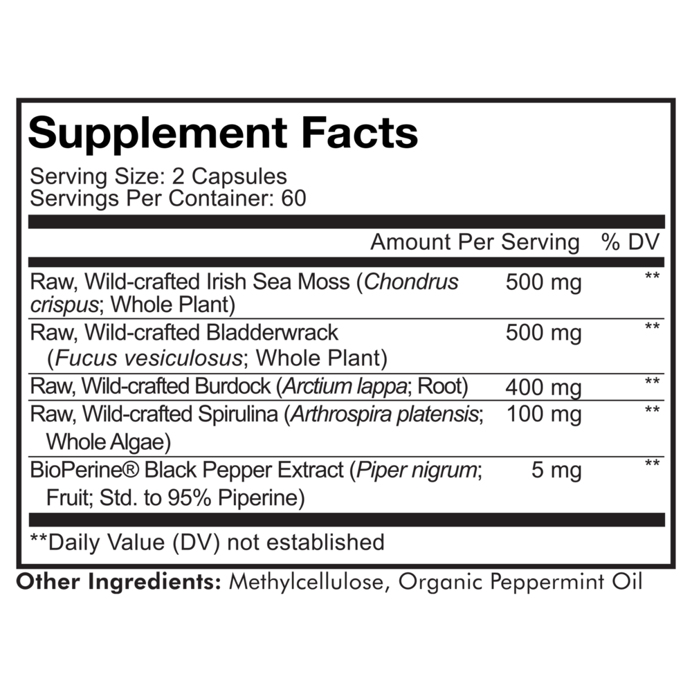 $34.99Codeage Wildcrafted Sea Moss delivers 500 mg per serving of raw wildcrafted Irish sea moss, a superfood-rich red seaweed. This raw seaweed vegan complex contains botanical extracts from raw Fucus vesiculosus, a comestible, and nutrient-rich brown algae also known as bladderwrack, which is sustainably wildcrafted and sourced, and 400 mg of wildcrafted burdock root per serving.This superfood supplement also features raw wildcrafted spirulina and BioPerine black pepper fruit extract standardized to 95% piperine. Organic peppermint oil has been added to this whole algae Arthrospira platensis formulation for no aftertaste. Each bottle of Codeage Wildcrafted Sea Moss offers 2 months of supply.