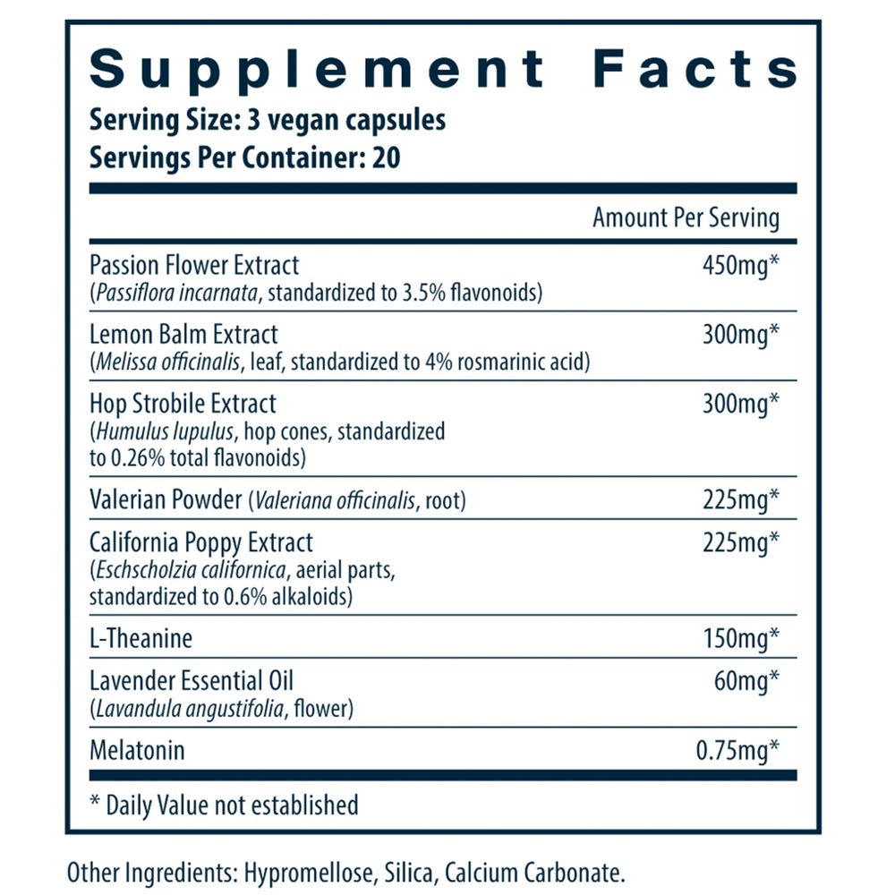 Sleep Aide contains a unique combination of 7 botanicals and melatonin to help promote restful sleep, and provide support to help calm the central nervous system. The ingredient Passiflora Extract is an important factor in the phytotherapy for the occasional relief of tenseness, restlessness and irritability associated with difficulty in falling asleep. California Poppy, L-Theanine, Lavender Essential Oil and Melatonin act synergistically to support the beneficial effects of the Sleep Aide formula. Sleep Aide provides safe, natural support to calm the central nervous system and encourage restful, refreshing sleep.