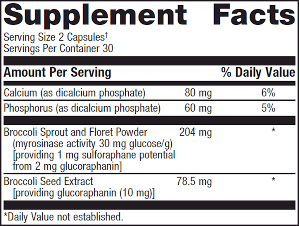 SulforaClear features Brassinase—a unique combination of broccoli ingredients that supply standardized amounts of glucoraphanin and active myrosinase enzyme to help support sulforaphane production. Sulforaphane is a potent activator of the body's own antioxidant and detoxifying enzymes and is responsible for many positive health benefits associated with broccoli consumption.