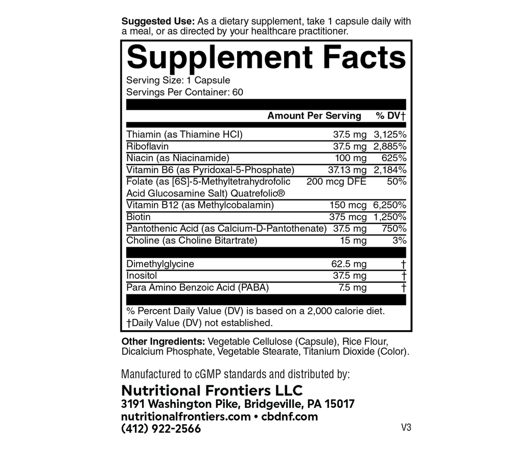$29.99This unique, high quality formula contains the most biologically active forms of many B-vitamins including B12 in the form of methylcobalamin. B-vitamins play many important roles in the body. For example, vitamin B12 and folic acid (Quatrefolic) are crucial for proper cell division; vitamins B1, B2, B3 and biotin are essential for energy production. Amino acid metabolism requires vitamin B6. Vitamin B5 is necessary for the synthesis of acetylcholine (a neurotransmitter) and is also involved with energy production. Some B vitamins have been shown to play a role in wound healing. Biotin is known to improve nail strength.